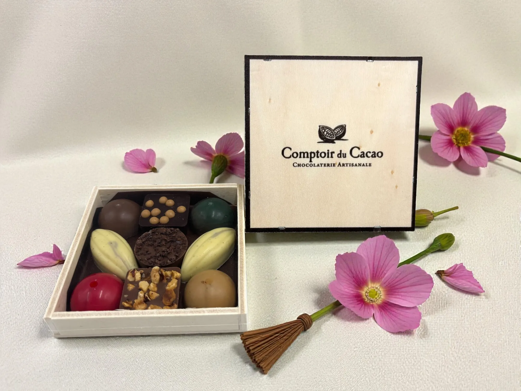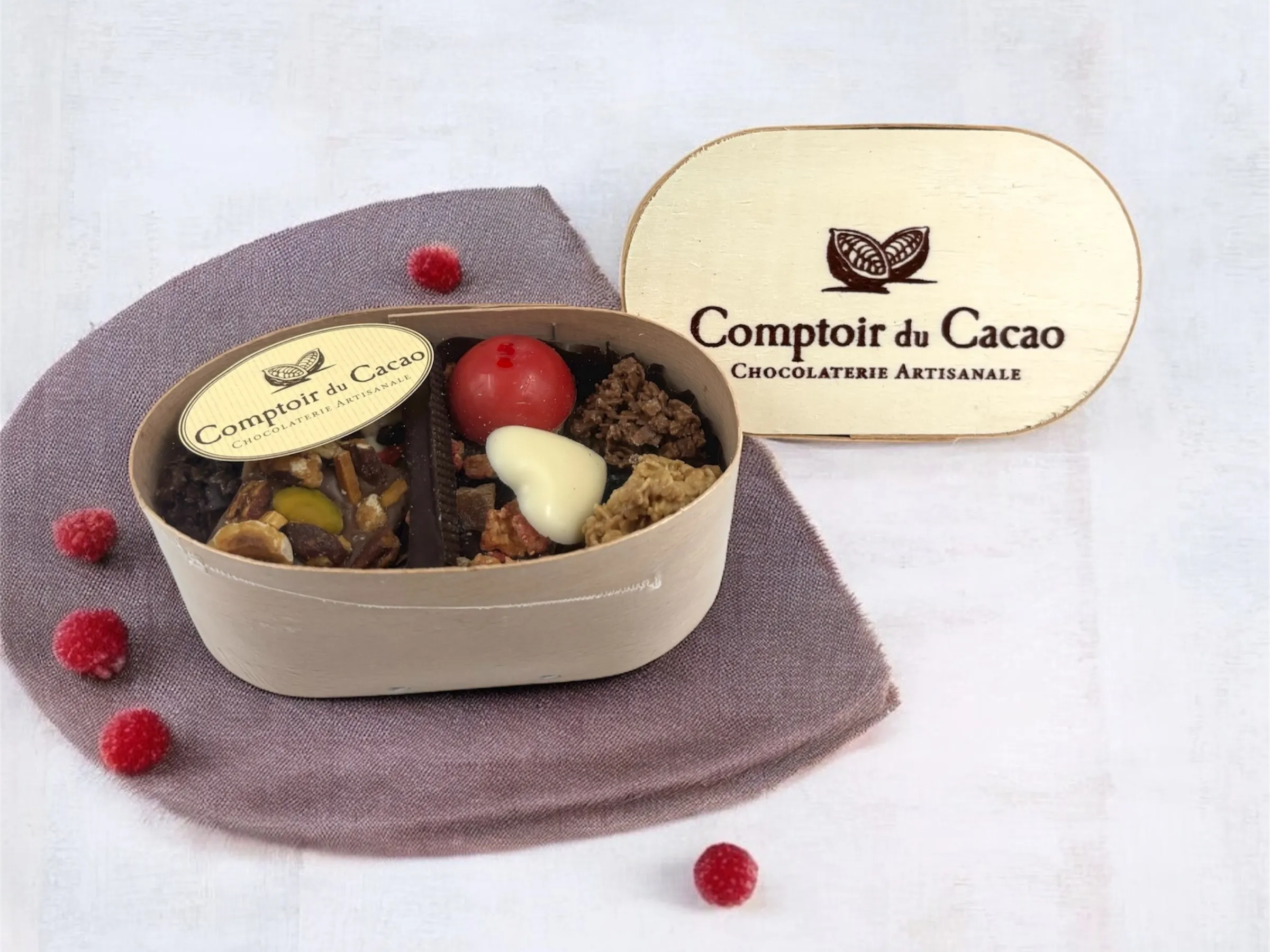 スペキュロス風味のプラリネに、爽やかなオレンジピールとホワイトチョコのハートを添えて、木箱いっぱいに詰め込んだ華やかな今季限定アソートボックスです。