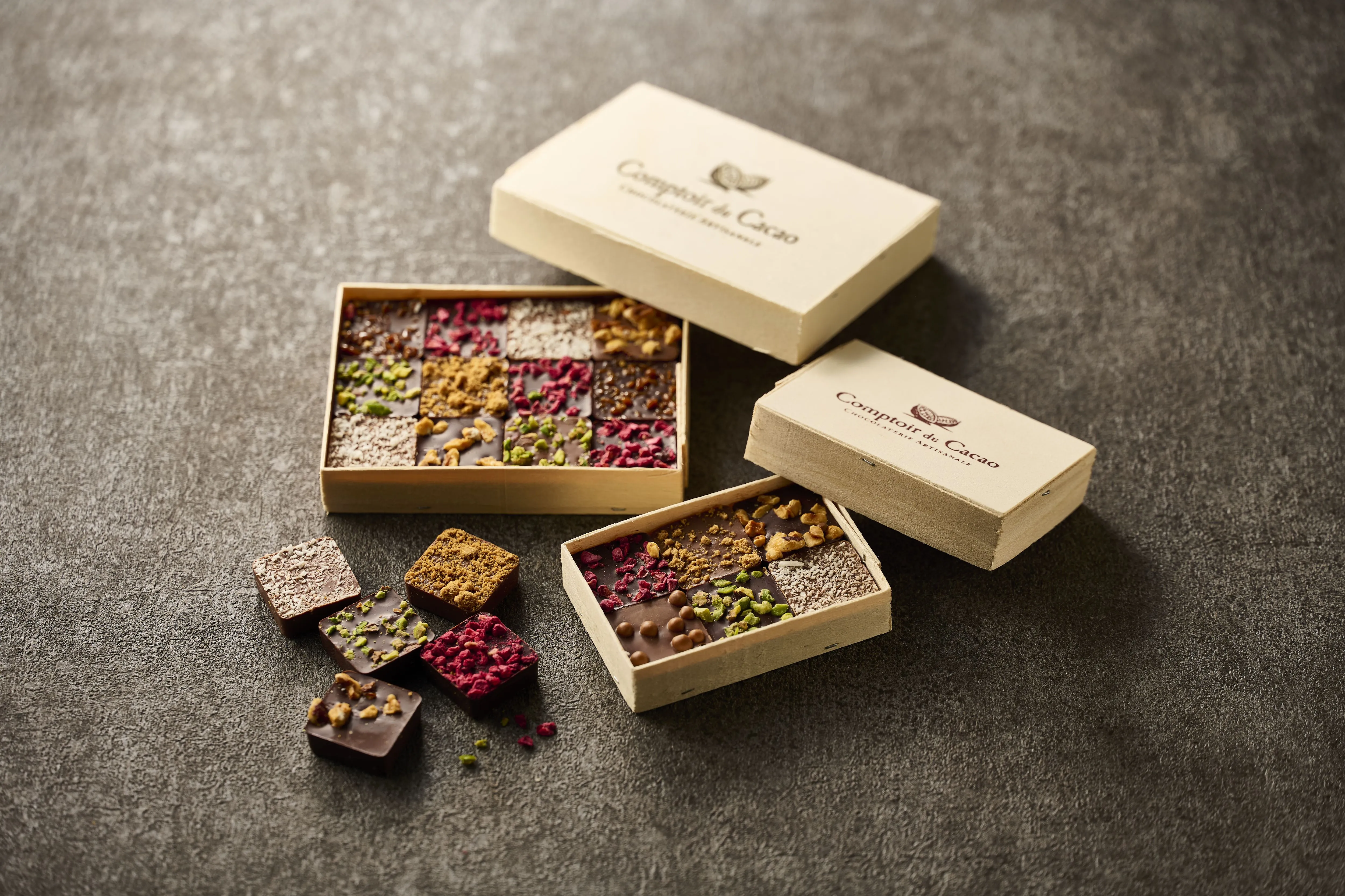 ダーク・ブロンド・ミルクチョコのクルスティンに、彩り豊かなフルーツと香ばしいナッツを贅沢に散りばめたクロッカンを12枚。
